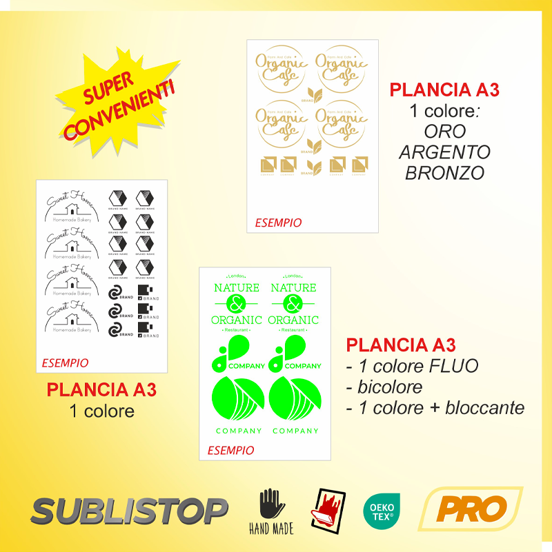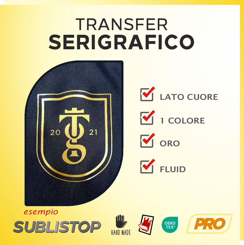Il transfer serigrafico termoadesivo (o termosaldabile) di nostra produzione è un prodotto esclusivamente serigrafico, disponbile anche in oro, argento e fluo, prodotto con inchiostro, di tipo transfer, studiato per essere applicato su tutti i capi, con un elevata elasticità, resistente agli strappi e alle sollecitazioni di gioco, morbido, sottile, facile e veloce da applicare, infatti, bastano appena 130° e 6 secondi di pressatura.